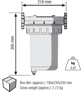 | Filter Unit Codes:  FG-100: 39023-CF00000 (Seals in NBR) FG-100G: 39071-CF00000 (Seals in FPM) Installation: Suction or Discharge Side of Pumps Dirt filtration - 5 micron removal Water Removal - 93% effective 2 Litre chamber Constructed Aluminium Head, Acrylic Vessel Flow rates up to 105 l/min Pressure up to 3 bar Filters 500 000 litres under under normal conditions Manual Water and Dirt drain valve 1" BSP Thread or Flanged Connection