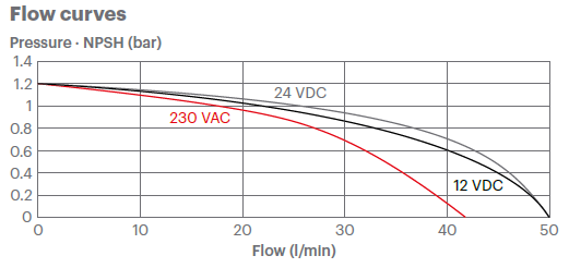 Delivery head up to 20m Self priming up to 2.7m Internal recycle valve Motor: 120W - IP55 Current; 12Vdc Pump - 15 to 25 A 24Vdc Pump - 7 to 12 A 230Vac Pump - 0.4 to 1 A