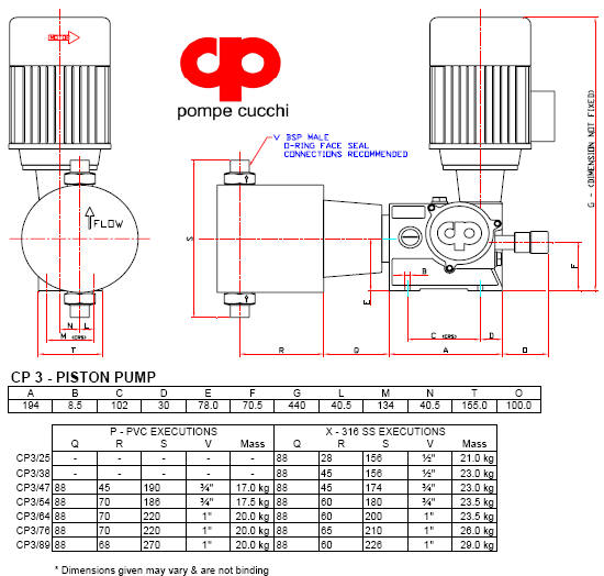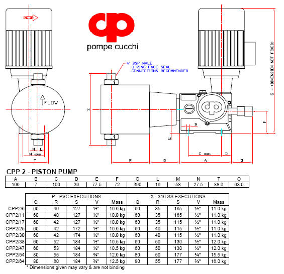 CP & CPP - PISTON WET ENDS Piston heads may be used when the liquids are clear, for liquids that are non-crystallising and do not contain particles in suspension.  The Wet-End consists of the Head, Valves, Piston and Piston Seals. Wet-End is connected to the gearbox via an intermediate spacing flange which prevents damage to the gearbox mechanism in the event of an aggressive fluid leak. On request more than one head, Multiplex Pump, can be assemble to allow for proportional metering of different fluids or double the flow range of the pump. Gravity assisted ball valves are a standard. Standard connection to the valves are with male BSP threads or preferably by O-ring face sealing connections. Special flanged connections are also available on request.. Standard Materials: XT = Head, Piston & Valves in S.S. AISI 316 / Piston Seals in PTFE XV = Head, Piston & Valves in S.S. AISI 316 / Piston Seals in FPM (Viton®) P = Head & Valves in µPVC / Piston in Ceramic / Piston Seals in FPM (Viton®)
