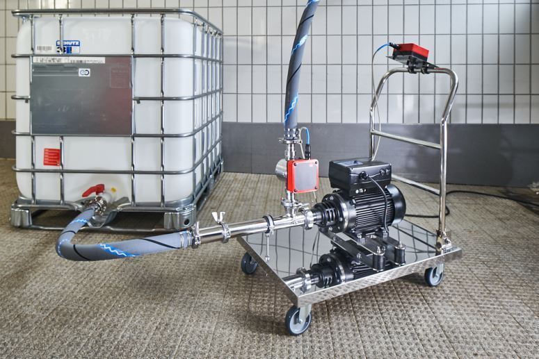 | | B70H Pump fitted with integrated variable speed motor. Requested extras for this application included a SS trolley, IBC suction hose, volume preset meter and delivery hose |  |